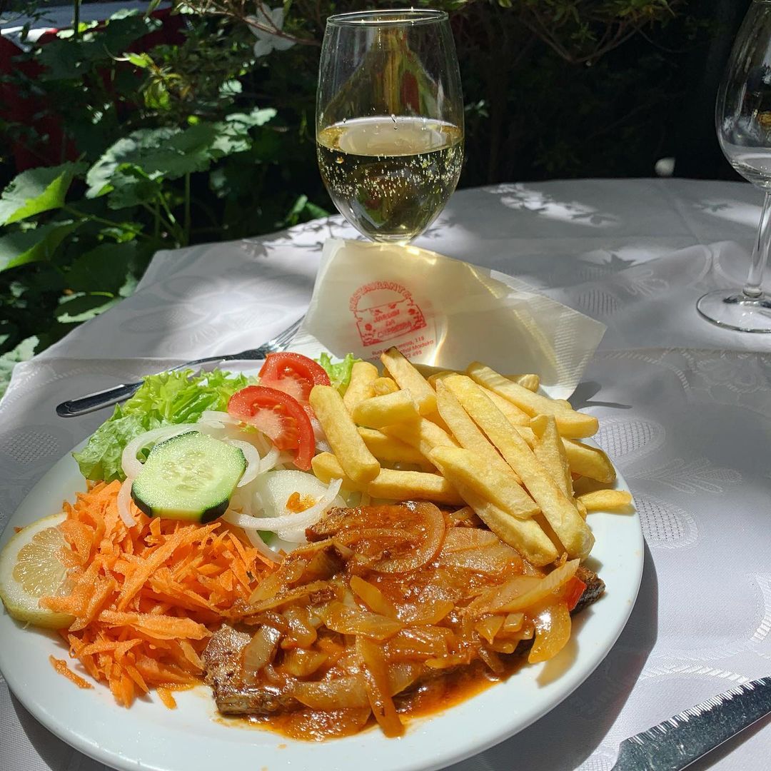 Restauracja Jardim da Carreira w Funchal, danie dnia stek z tuńczyka z cebulą. Każdego dnia można wybrać jedzenie na jakie ma się ochotę jako danie dnia. Cena jedyne 5,50 e. Lampka białego chłodnego wina wskazana wśród promieni słonecznych ogrodu.Zapraszam