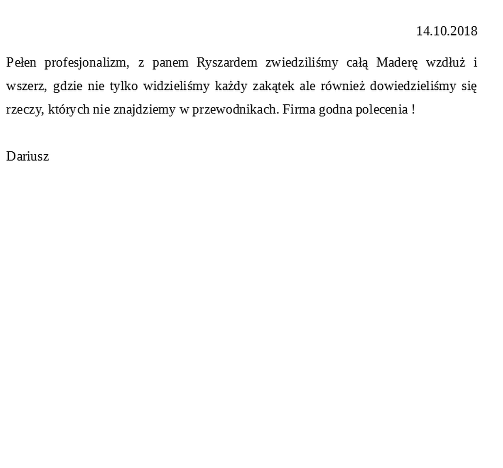 Pełen profesjonalizm, z panem Ryszardem zwiedziliśmy całą Maderę wzdłuż i wszerz, gdzie nie tylko widzieliśmy każdy zakątek ale również dowiedzieliśmy się rzeczy, których nie znajdziemy w przewodnikach. Firma godna polecenia !