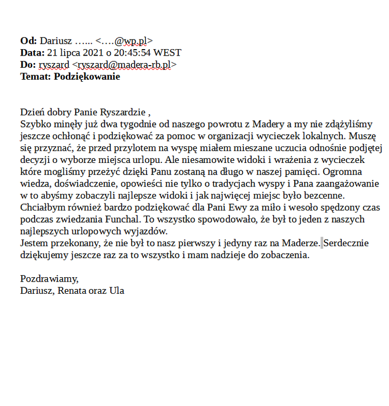 Szybko minęły już dwa tygodnie od naszego powrotu z Madery a my nie zdążyliśmy jeszcze ochłonąć i podziękować za pomoc w organizacji wycieczek lokalnych. Muszę się przyznać, że przed przylotem na wyspę miałem mieszane uczucia odnośnie podjętej decyzji o wyborze miejsca urlopu. Ale niesamowite widoki i wrażenia z wycieczek które mogliśmy przeżyć dzięki Panu zostaną na długo w naszej pamięci. Ogromna wiedza, doświadczenie, opowieści nie tylko o tradycjach wyspy i Pana zaangażowanie w to abyśmy zobaczyli najlepsze widoki i jak najwięcej miejsc było bezcenne. Chciałbym również bardzo podziękować dla Pani Ewy za miło i wesoło spędzony czas podczas zwiedzania Funchal. To wszystko spowodowało, że był to jeden z naszych najlepszych urlopowych wyjazdów.