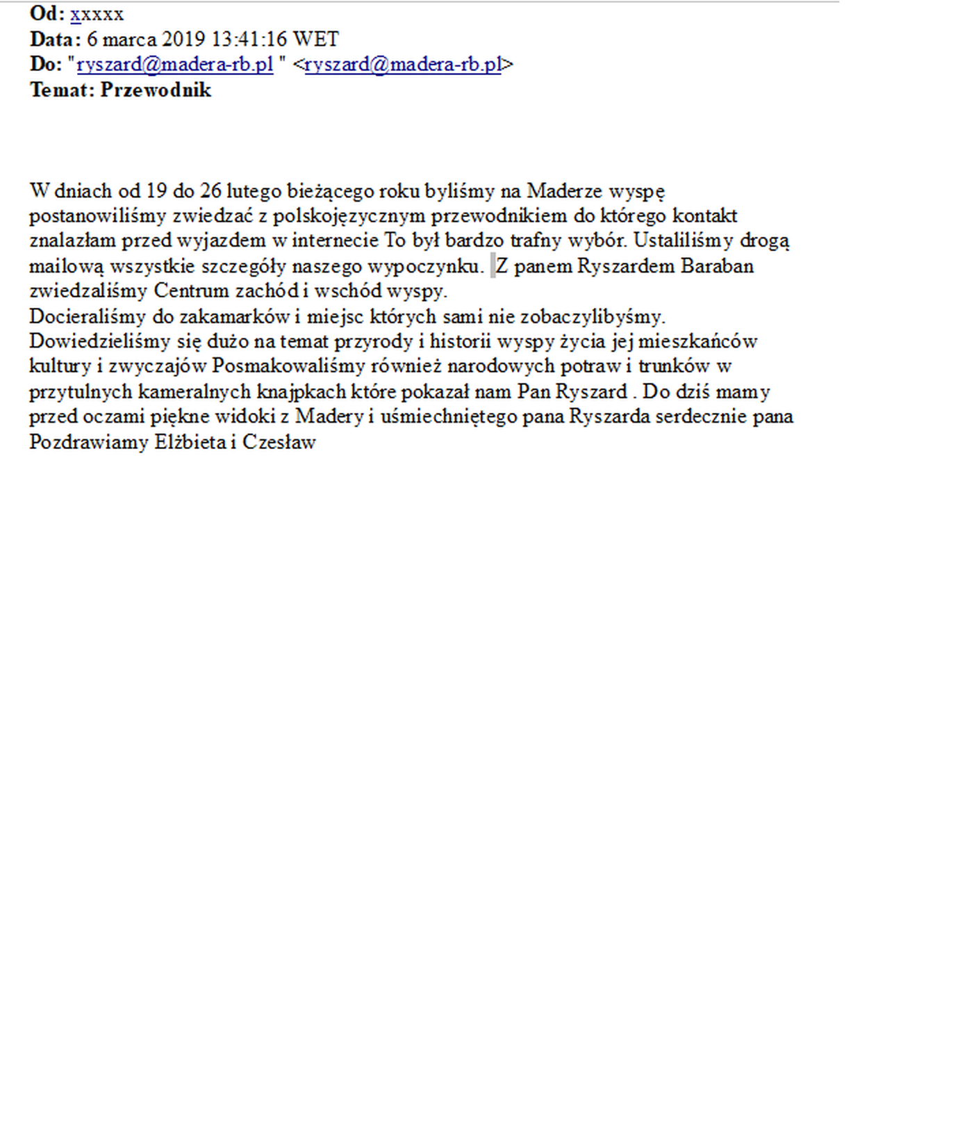 Docieraliśmy do zakamarków i miejsc których sami nie zobaczylibyśmy. Dowiedzieliśmy się dużo na temat przyrody i historii wyspy życia jej mieszkańców kultury i zwyczajów Posmakowaliśmy również narodowych potraw i trunków w przytulnych kameralnych knajpkach które pokazał nam Pan Ryszard . Do dziś mamy przed oczami piękne widoki z Madery i uśmiechniętego pana Ryszarda serdecznie pana Pozdrawiamy Elżbieta i Czesław