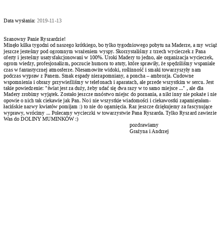 Minęło kilka tygodni od naszego krótkiego, bo tylko tygodniowego pobytu na Maderze, a my wciąż jeszcze jesteśmy pod ogromnym wrażeniem wyspy. Skorzystaliśmy z trzech wycieczek z Pana oferty i jesteśmy usatysfakcjonowani w 100%. Uroki Madery to jedno, ale organizacja wycieczek, ogrom wiedzy, profesjonalizm, poczucie humoru to atuty, które sprawiły, że spędziliśmy wspaniale czas w fantastycznej atmosferze. Niesamowite widoki, roślinność i smaki towarzyszyły nam podczas wypraw z Panem. Smak espady niezapomniany, a poncha – ambrozja. Cudowne wspomnienia i obrazy przywieźliśmy w telefonach i aparatach, ale przede wszystkim w sercu. Jest takie powiedzenie: "świat jest za duży, żeby udać się dwa razy w to samo miejsce ..." , ale dla Madery zrobimy wyjątek. Zostało jeszcze mnóstwo miejsc do poznania, a nikt inny nie pokaże i nie opowie o nich tak ciekawie jak Pan. No i nie wszystkie wiadomości i ciekawostki zapamiętałam- łacińskie nazwy kwiatów pomijam :) to nie do ogarnięcia. Raz jeszcze dziękujemy za fascynujące wyprawy, wrócimy ... Polecamy wycieczki w towarzystwie Pana Ryszarda. Tylko Ryszard zawiezie Was do DOLINY MUMINKÓW :)