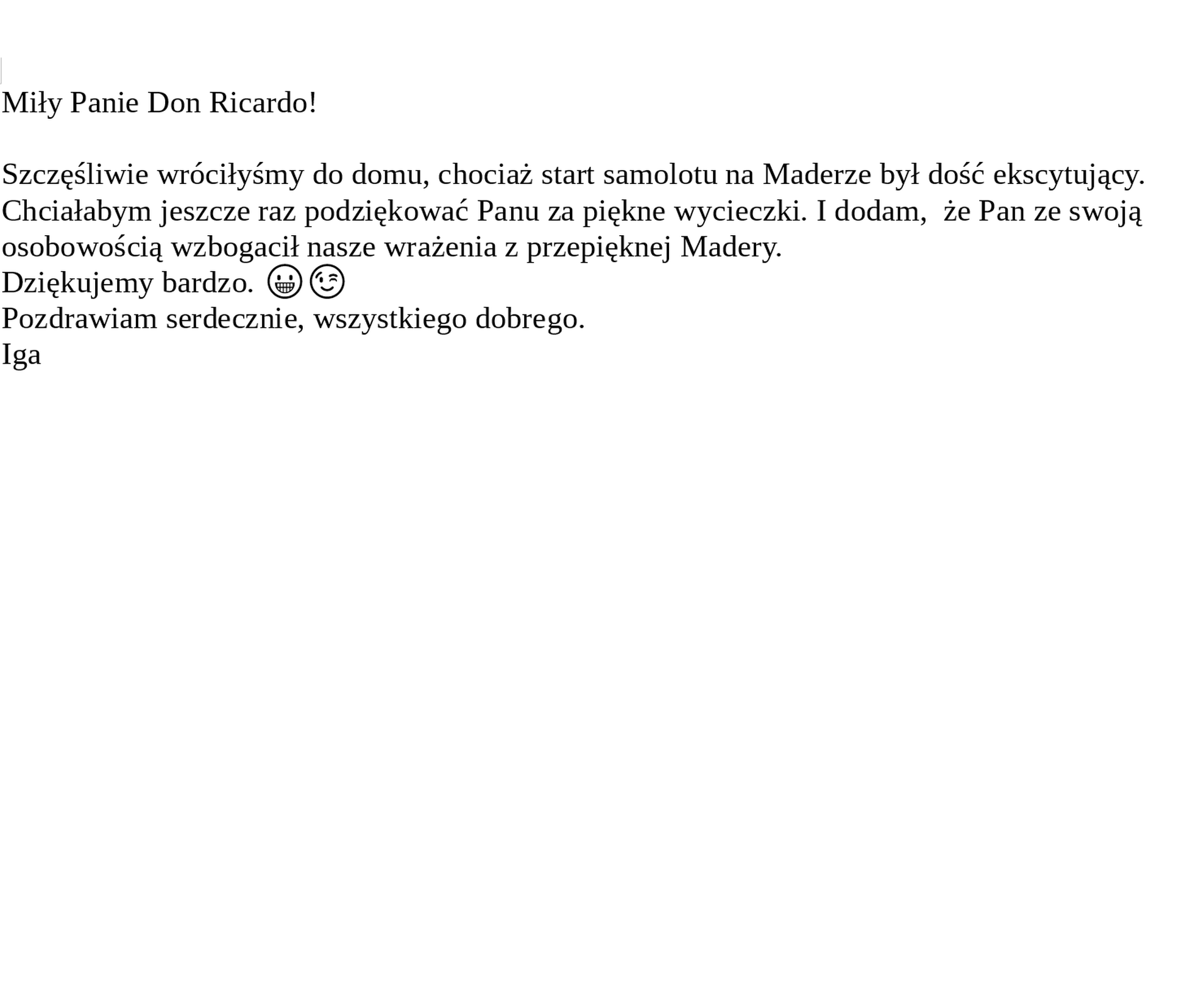 Szczęśliwie wróciłyśmy do domu, chociaż start samolotu na Maderze był dość ekscytujący. Chciałabym jeszcze raz podziękować Panu za piękne wycieczki. I dodam, że Pan ze swoją osobowością wzbogacił nasze wrażenia z przepięknej Madery. Dziękujemy bardzo. 😀😉Pozdrawiam serdecznie, wszystkiego dobrego.