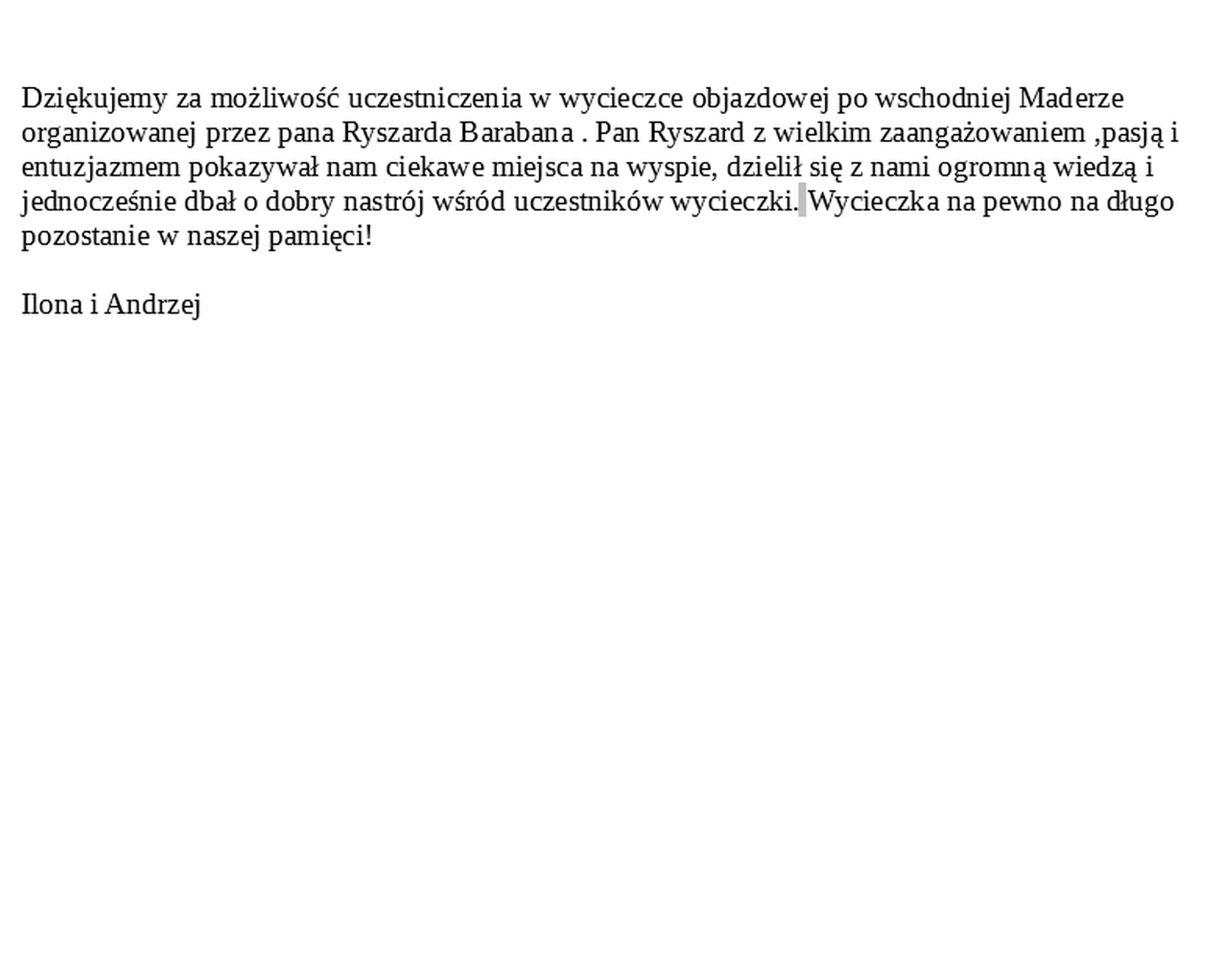 Dziękujemy za możliwość uczestniczenia w wycieczce objazdowej po wschodniej Maderze organizowanej przez pana Ryszarda Barabana . Pan Ryszard z wielkim zaangażowaniem ,pasją i entuzjazmem pokazywał nam ciekawe miejsca na wyspie, dzielił się z nami ogromną wiedzą i jednocześnie dbał o dobry nastrój wśród uczestników wycieczki. Wycieczka na pewno na długo pozostanie w naszej pamięci!