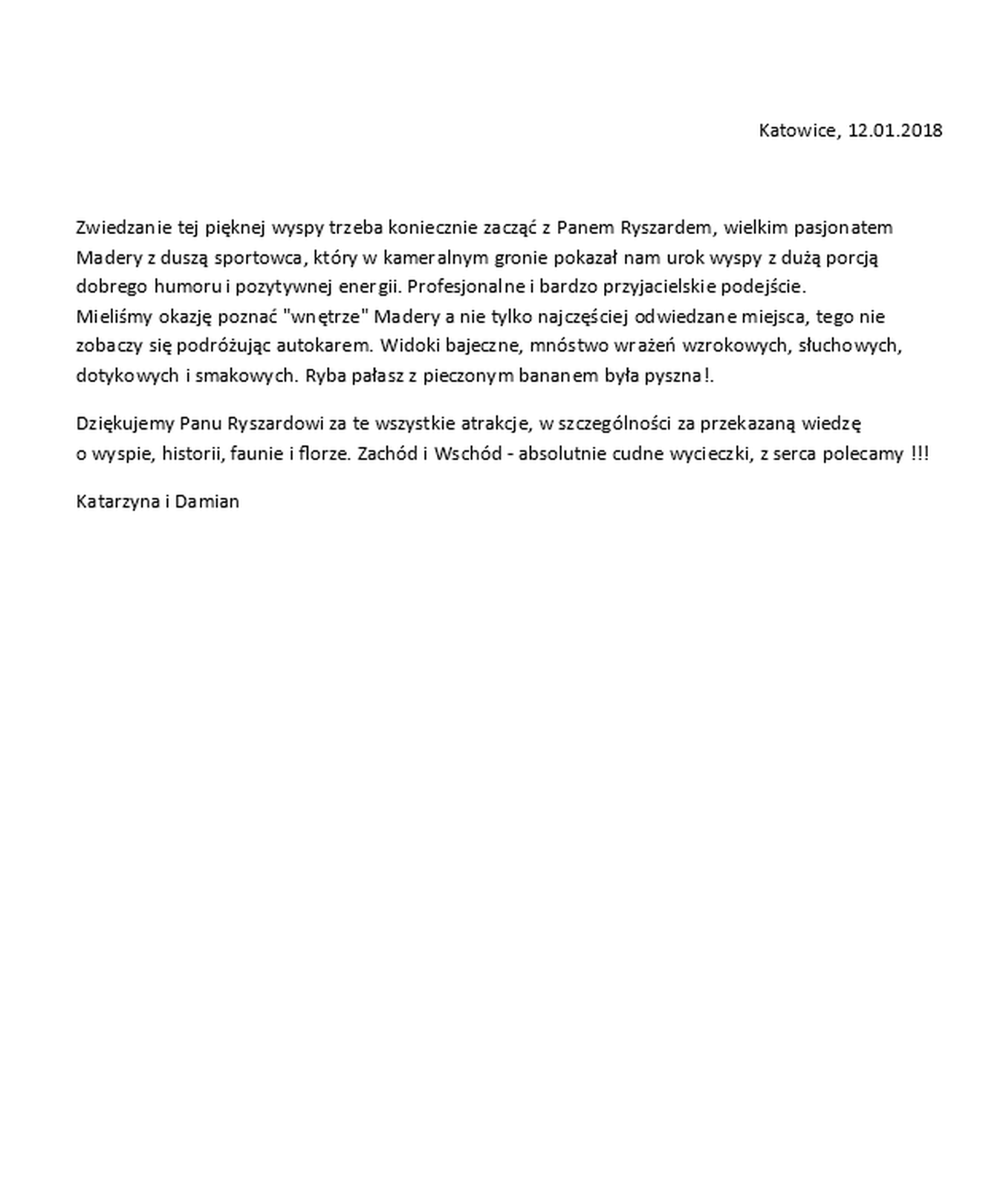 Zwiedzanie tej pięknej wyspy trzeba koniecznie zacząć z Panem Ryszardem, wielkim pasjonatem Madery z duszą sportowca, który w kameralnym gronie pokazał nam urok wyspy z dużą porcją dobrego humoru i pozytywnej energii. Profesjonalne i bardzo przyjacielskie podejście. Mieliśmy okazję poznać "wnętrze" Madery a nie tylko najczęściej odwiedzane miejsca, tego nie zobaczy się podróżując autokarem. Widoki bajeczne, mnóstwo wrażeń wzrokowych, słuchowych, dotykowych i smakowych. Ryba pałasz z pieczonym bananem była pyszna!.