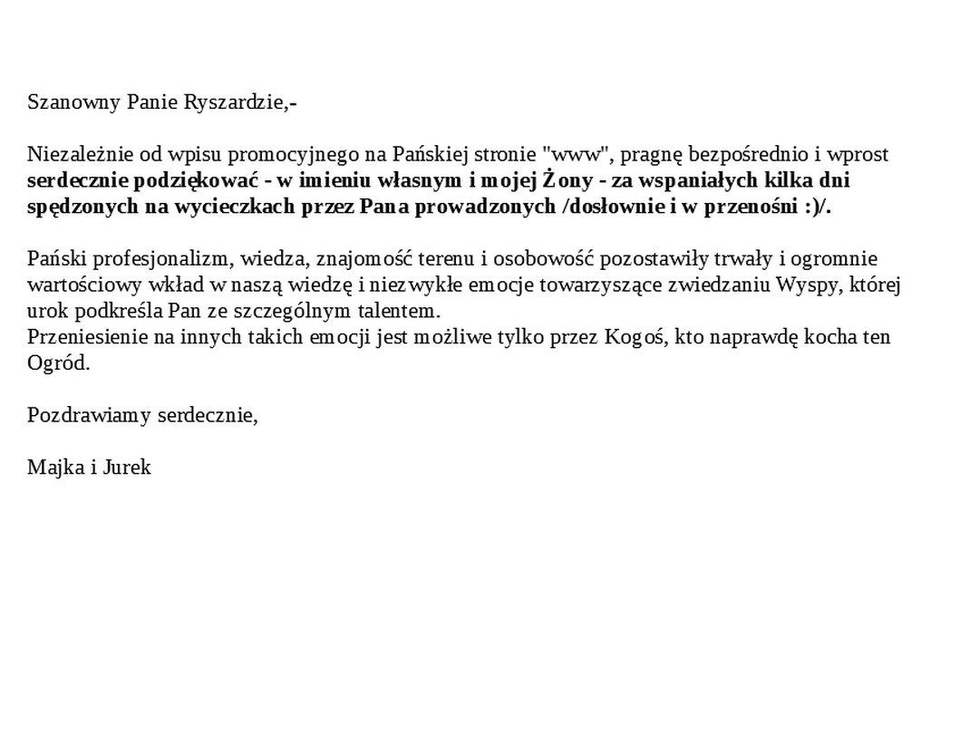 Pański profesjonalizm, wiedza, znajomość terenu i osobowość pozostawiły trwały i ogromnie wartościowy wkład w naszą wiedzę i niezwykłe emocje towarzyszące zwiedzaniu Wyspy, której urok podkreśla Pan ze szczególnym talentem.