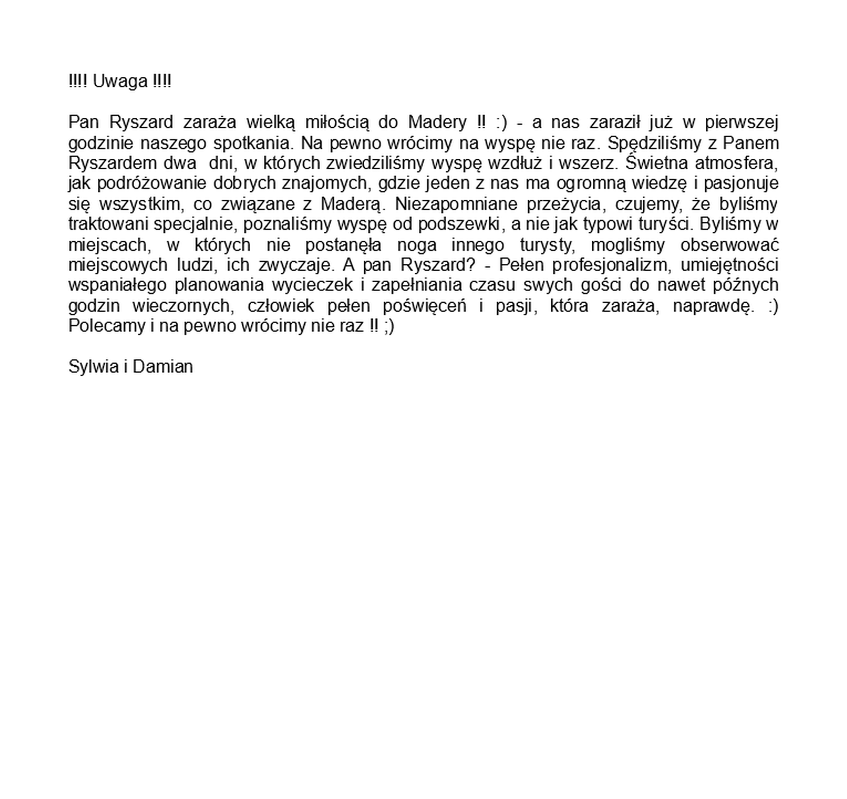 Pan Ryszard zaraża wielką miłością do Madery !! :) - a nas zaraził już w pierwszej godzinie naszego spotkania. Na pewno wrócimy na wyspę nie raz. Spędziliśmy z Panem Ryszardem dwa dni, w których zwiedziliśmy wyspę wzdłuż i wszerz. Świetna atmosfera, jak podróżowanie dobrych znajomych, gdzie jeden z nas ma ogromną wiedzę i pasjonuje się wszystkim, co związane z Maderą. Niezapomniane przeżycia, czujemy, że byliśmy traktowani specjalnie, poznaliśmy wyspę od podszewki, a nie jak typowi turyści. Byliśmy w miejscach, w których nie postanęła noga innego turysty, mogliśmy obserwować miejscowych ludzi, ich zwyczaje. A pan Ryszard? - Pełen profesjonalizm, umiejętności wspaniałego planowania wycieczek i zapełniania czasu swych gości do nawet późnych godzin wieczornych, człowiek pełen poświęceń i pasji, która zaraża, naprawdę. :) Polecamy i na pewno wrócimy nie raz !! ;)