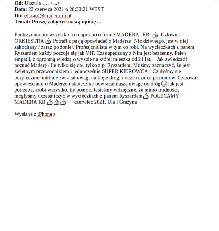 Podtrzymujemy wszystko, co napisano o firmie MADERA- RB 👍 Człowiek ORKIESTRA 👍 Potrafi z pasją opowiadać o Maderze! Nic dziwnego, jest w niej zakochany / zaraz po żonie/. Profesjonalista w tym co robi. Na wycieczkach z panem Ryszardem każdy poczuje się jak VIP. Czas spędzony z Nim jest bezcenny. Pełen empatii, z ogromną wiedzą o wyspie na której mieszka od 21 lat. Jak zwiedzać i poznać Maderę / ile tylko się da/, tylko z p. Ryszardem. Musimy zaznaczyć, że jest świetnym przewodnikiem i jednocześnie SUPER KIEROWCĄ ! Czułyśmy się bezpiecznie, nikt nie zwracał uwagi na kręte drogi i duże różnice poziomów. Czarował opowieściami o Maderze i skutecznie odwracał naszą uwagę od dróg😀Jak jest potrzeba, zrobi wszystko, by pomóc. Jesteśmy wdzięczne, że mimo trudności, mogłyśmy uczestniczyć w wycieczkach z panem Ryszardem👍 POLECAMY MADERA RB 👍👍👍 czerwiec 2021. Ula i Grażyna