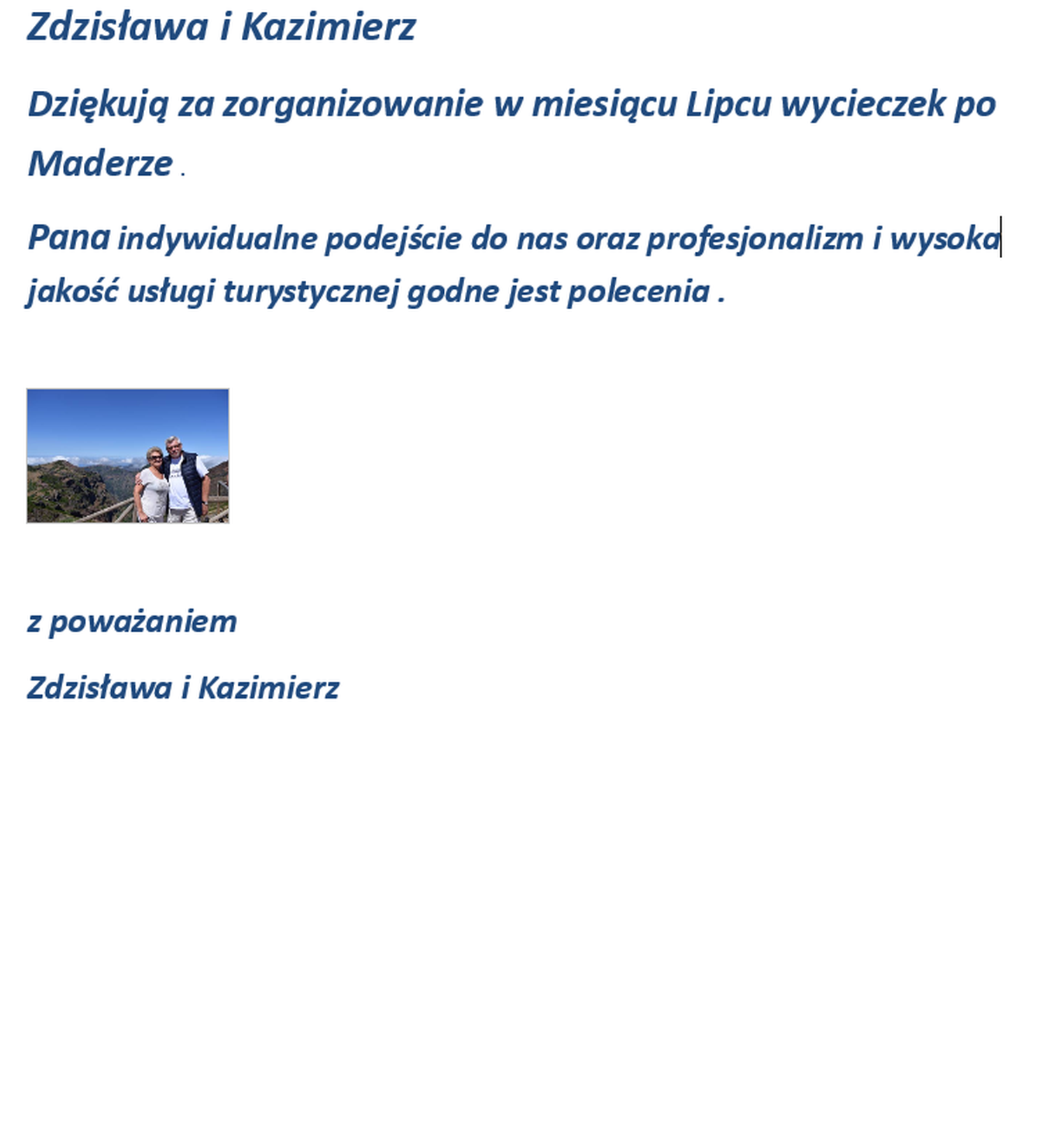 Zdzisława i KazimierzPrzemyśl12.08.2018Zdzisława i Kazimierz Dziękują za zorganizowanie w miesiącu Lipcu wycieczek po Maderze. Pana indywidualne podejście do nas oraz profesjonalizm i wysoka jakość usługi turystycznej godne jest polecenia . Z poważaniem Zdzisława i Kazimierz